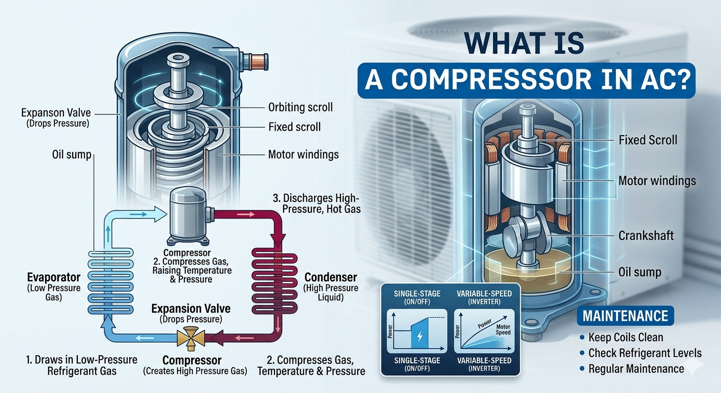 An AC compressor is the mechanical heart of an air conditioning system that circulates refrigerant under high pressure to facilitate heat exchange. By squeezing the refrigerant gas, the compressor raises its temperature and pressure, allowing it to release heat as it flows through the outdoor condenser coils. Without a functional compressor, an air conditioner cannot move heat from inside a building to the outside, rendering the entire cooling process impossible.